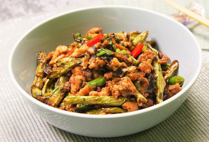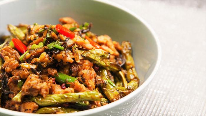 四季豆300克、紅花椒5克、薑蓉10克、蒜蓉10克、油適量、素豬肉150克、欖菜10克、辣椒10克、蔥20克