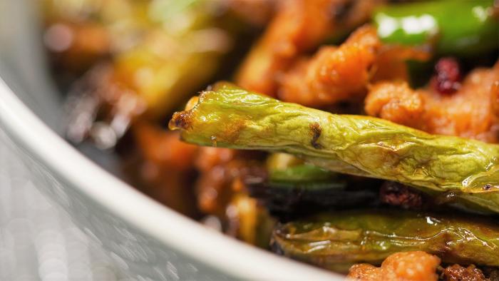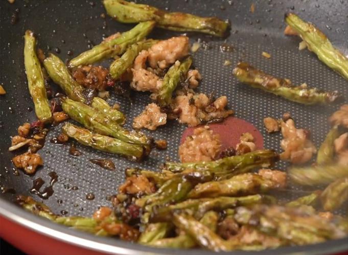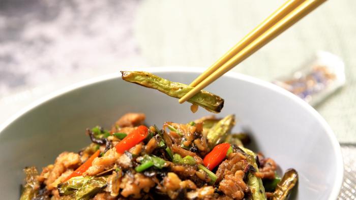 或放入氣炸鍋以180°C氣炸10分鐘,這樣可保留四季豆水分亦不過幹。要突顯乾煸四季豆的鮮香味,秘密武器便是加入欖菜一起炒。
