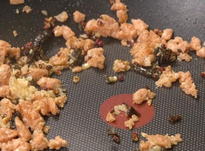 - 3)中火加熱油鍋,先炒紅花椒至香味溢位,加入素豬肉,並用鍋鏟推散。